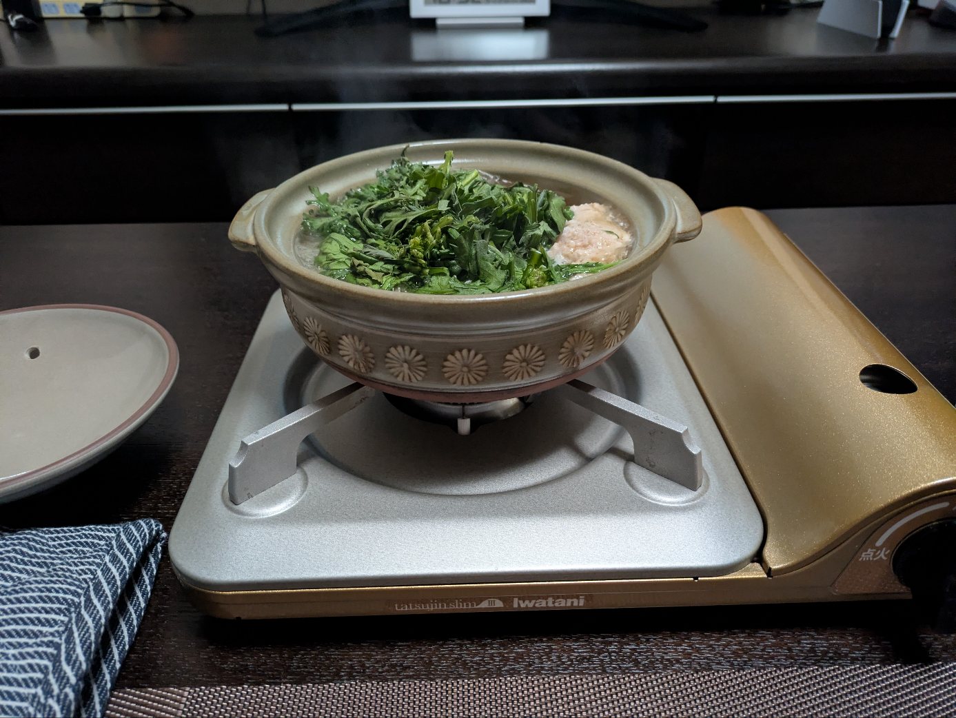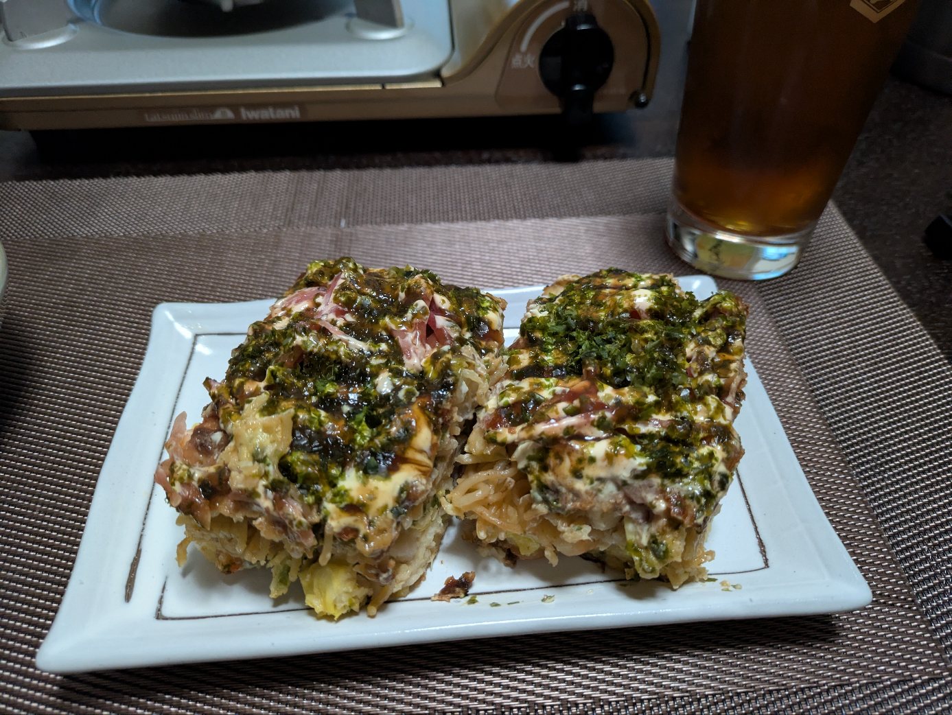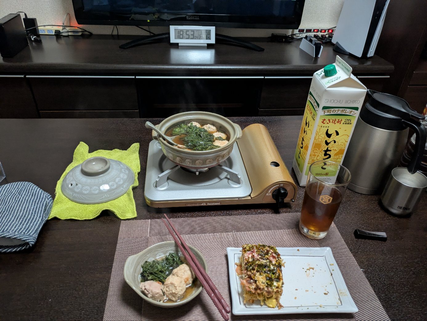 そう言えば昨日のお好み焼きも残してたなぁと、鍋が出来るまでつまむ。
