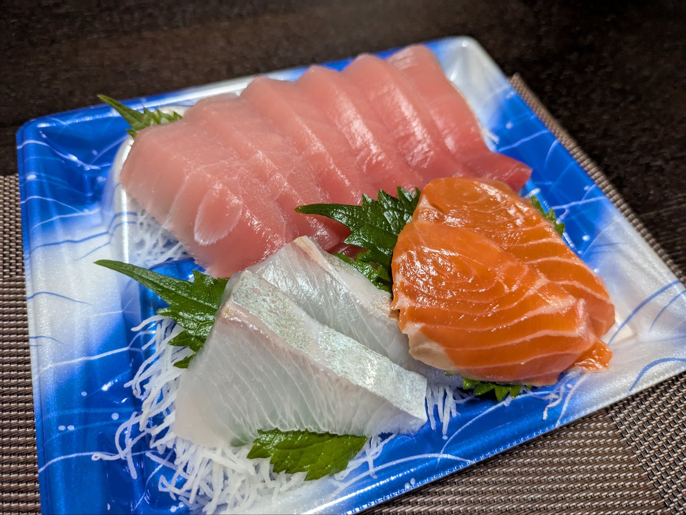 散髪の帰りに刺身を買ってきた。マグロと鯖、今夜は青魚で一杯だな。