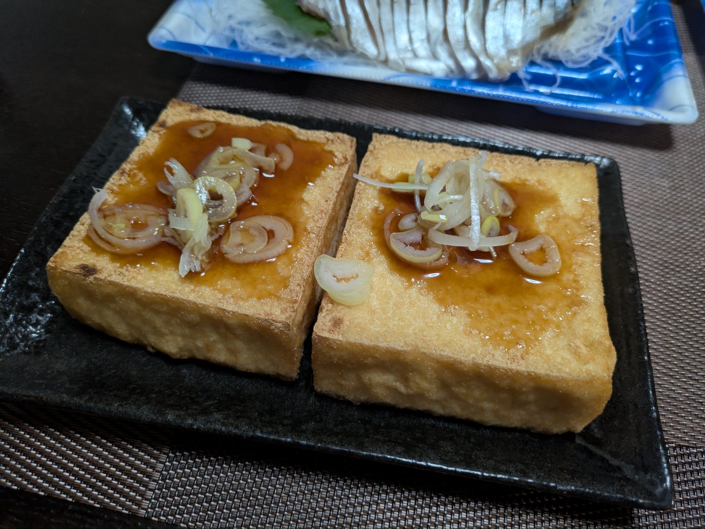 刺身だけじゃ足りないかなと、厚揚げも焼きました。生姜買うの忘れたなぁ。