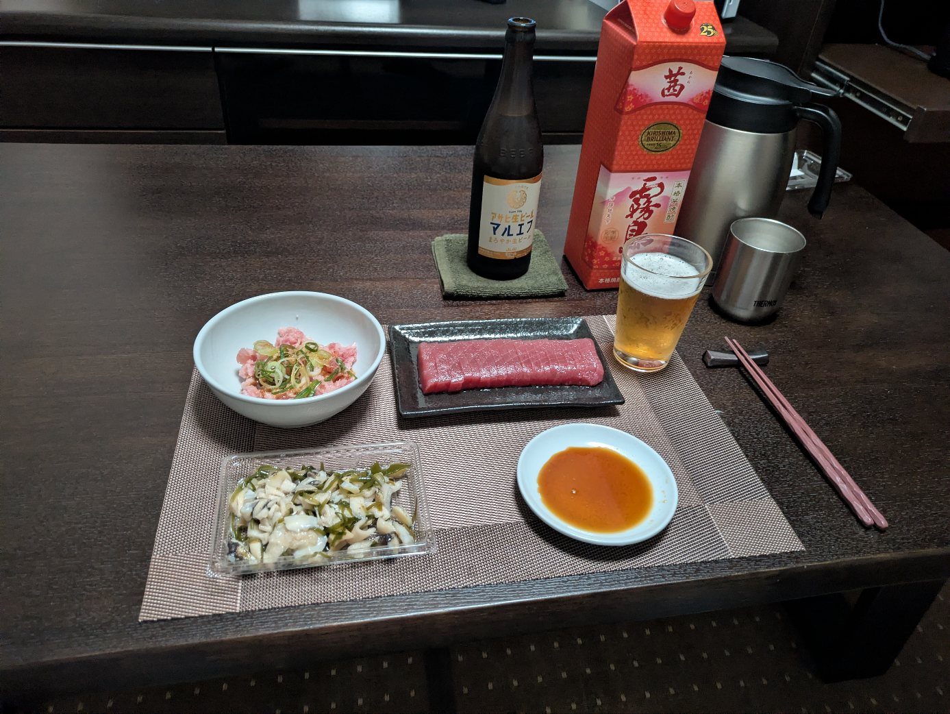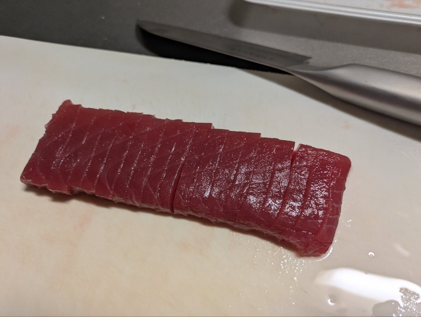 今日は久しぶりのポカポカ陽気、こんな日は刺身が美味い。マグロの柵を買ってきたんで早速。