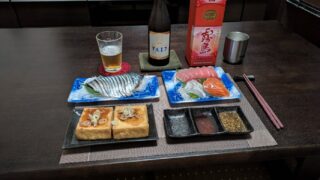解禁初日は刺身から。おかず用で作り置きした筑前煮も余っているので、それにも箸をつけながら始めていきましょう。