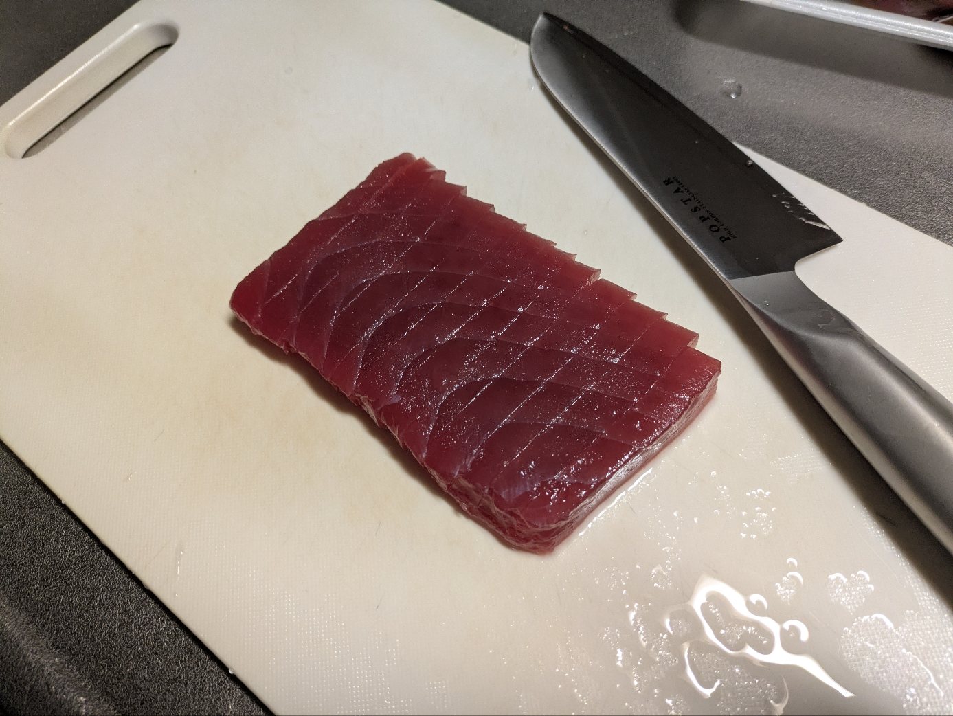 今日のつまみは刺身にしようと、マグロの柵を買ってきた。