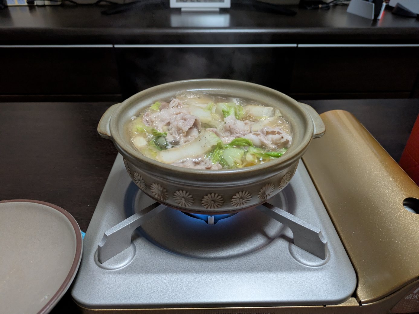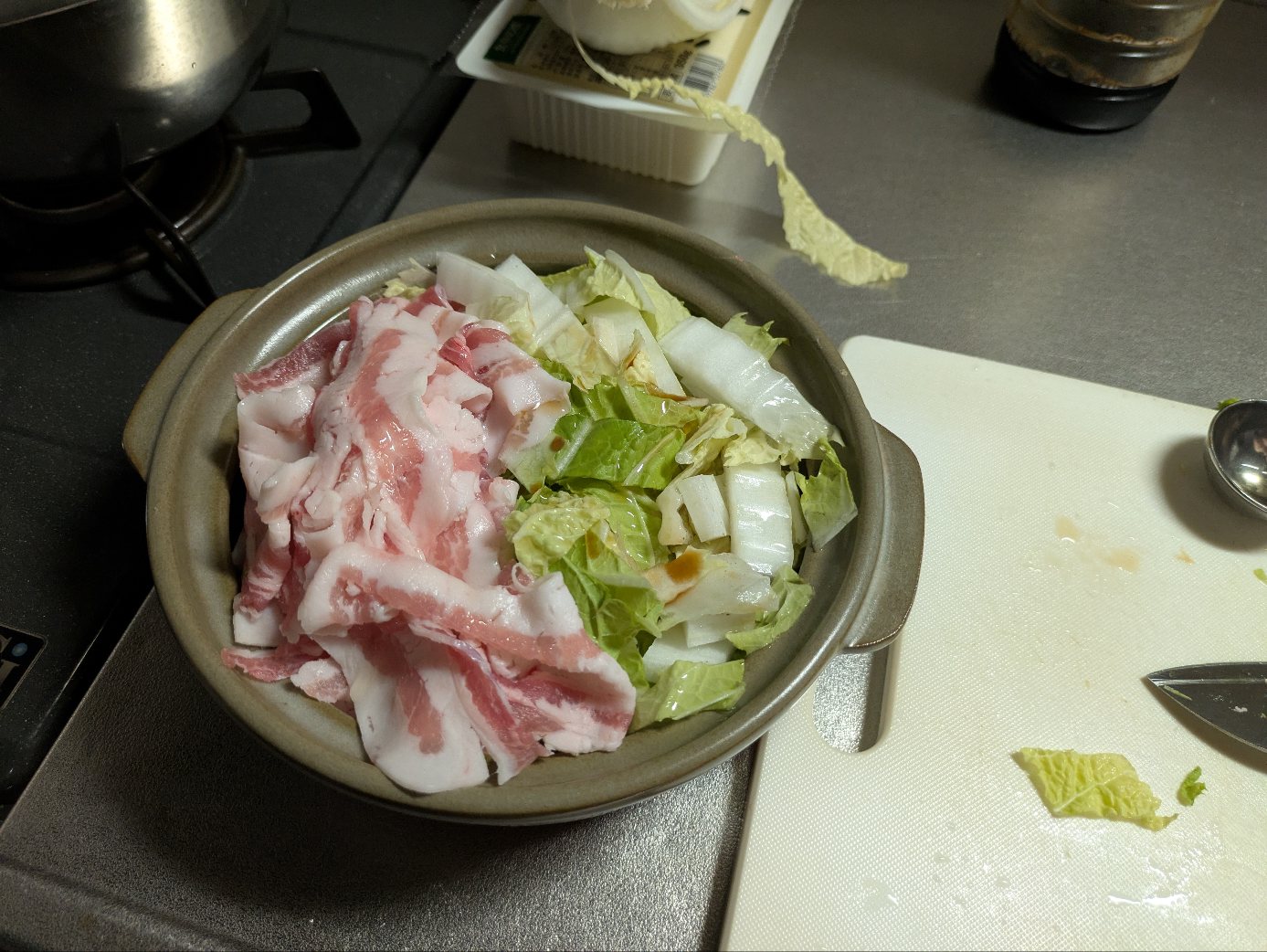 白菜と豚バラを買ってきたんで鍋にしてみる。適当に作ってもそれなりに仕上がるのが鍋の良いところ。